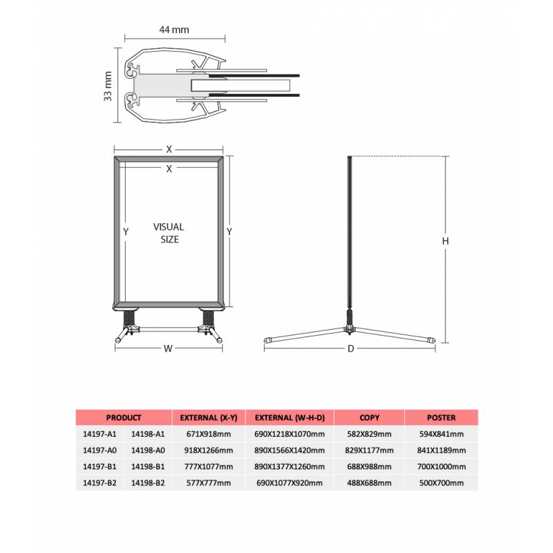 Caballete a doble cara, fabricado en aluminio de color negro de 44 mm, con muelles en su parte inferior para facilitar su inclinación y conseguir una menor resistencia al viento