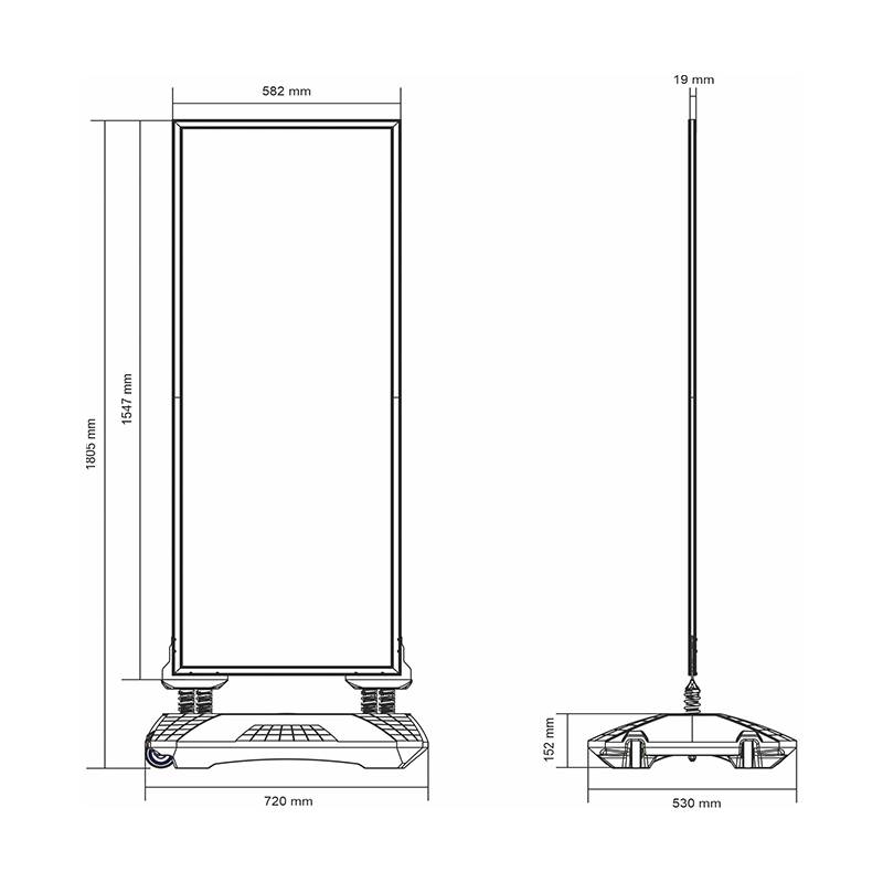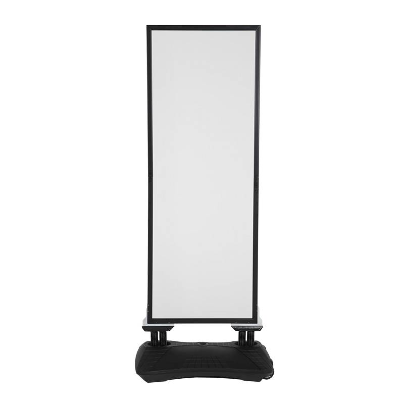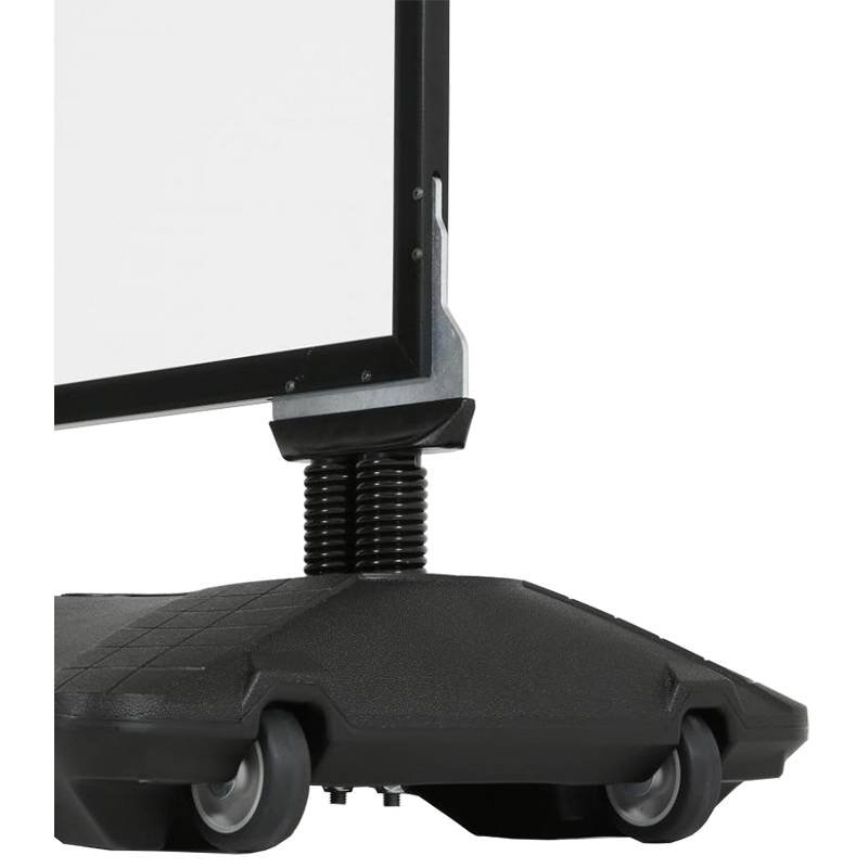 Marco a 2 caras. Fabricado en aluminio. El display tiene muelles para facilitar la inclinación del marco y base de plástico para rellenar con 24 litros de agua o arena.