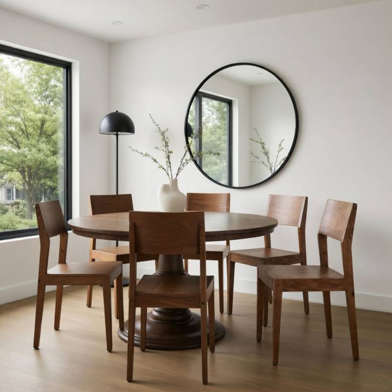 Mesa de comedor de Madera De Mango en acabado marrón, amplia y luminosa.