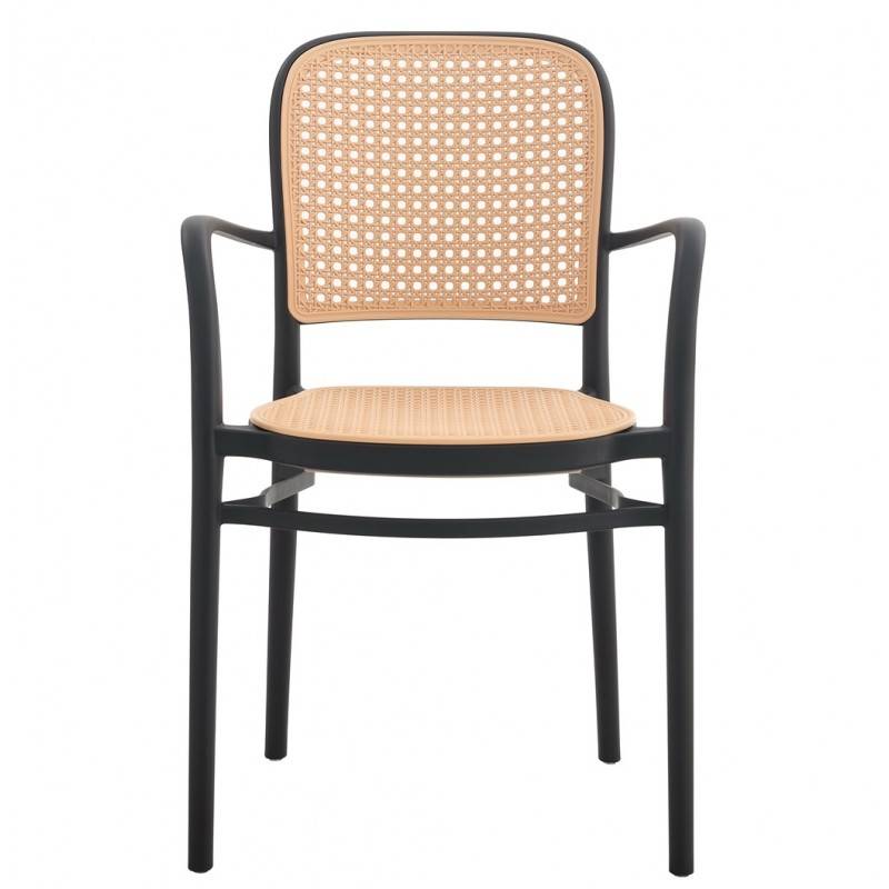 Fabricado 100 % con Polipropileno, color negro con asiento y respaldo en rejilla beige.