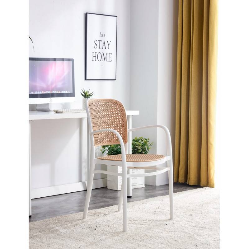 Fabricado 100 % con Polipropileno, color blanco con asiento y respaldo en rejilla beige.