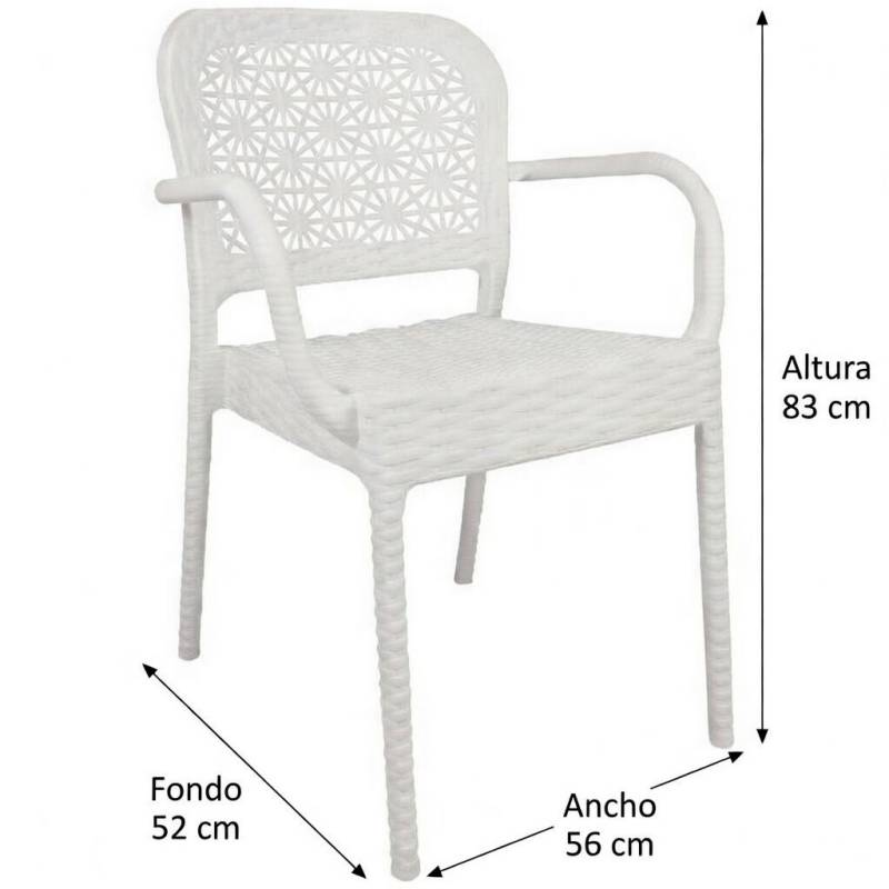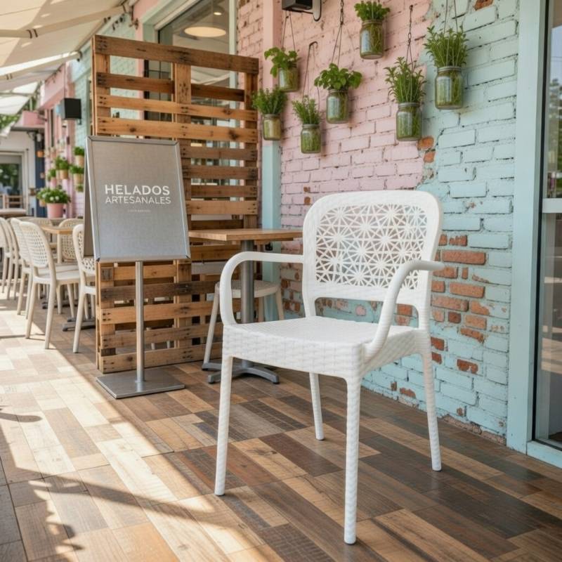 Sillón apilable, imitación a ratan fabricado en polipropileno. Uso en exterior e interior.