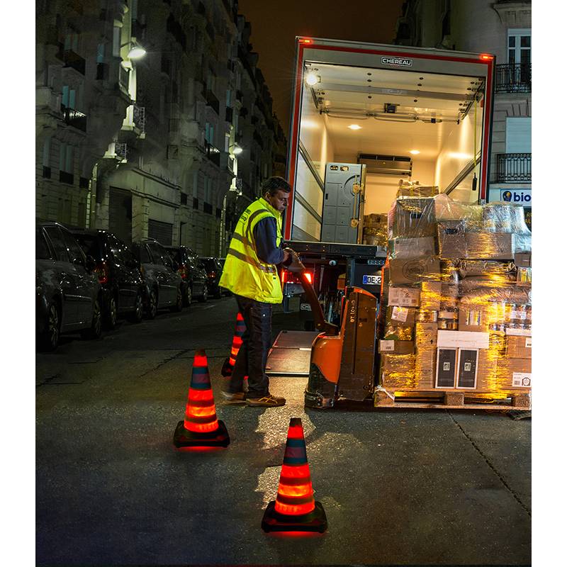 CONO DE BALIZAMIENTO PLEGABLE, CON LUZ LED, FRANJA REFLECTANTE y BASE CAUCHO.