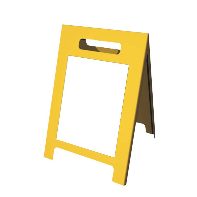 Caballete plegable fácil de personalizar, transportar y guardar, fabricado en de PVC amarilo de 3 mm.