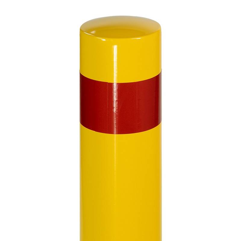 Su acabado epoxi en color amarillo seguridad garantiza una visibilidad óptima, mientras que la banda roja reflectante mejora la detección en entornos con poca luz, incrementando la seguridad tanto de peatones como de vehículos.