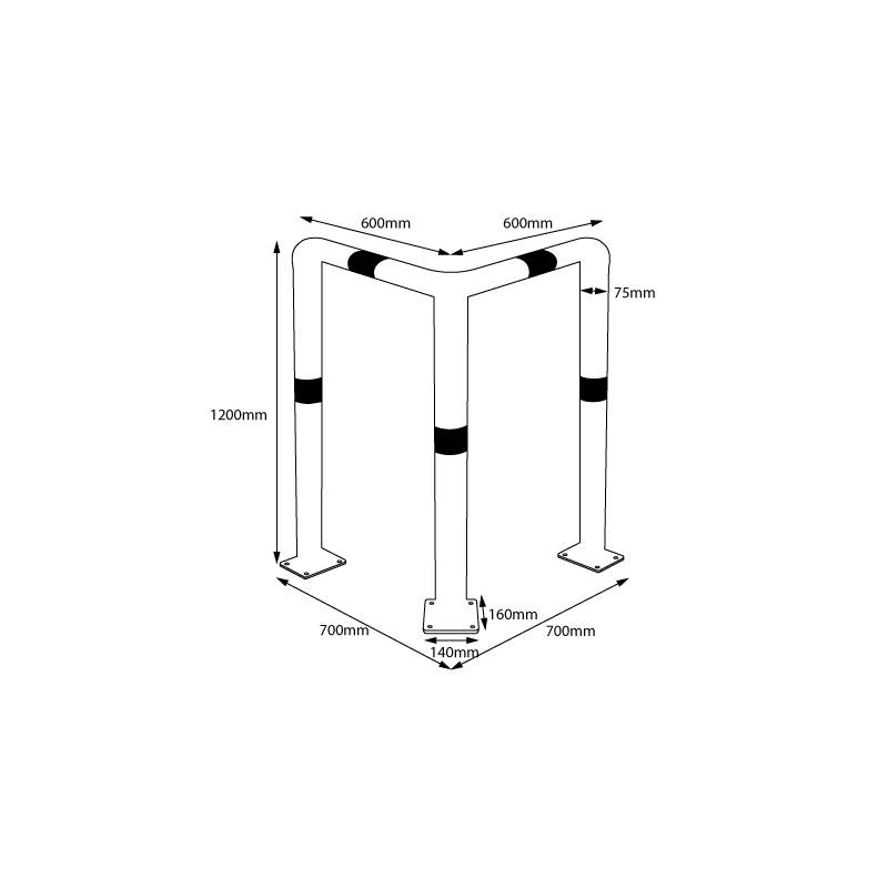 El diseño en ángulo de 90° permite su instalación en esquinas, columnas o áreas perimetrales, ofreciendo una protección envolvente y compacta sin ocupar espacio adicional.