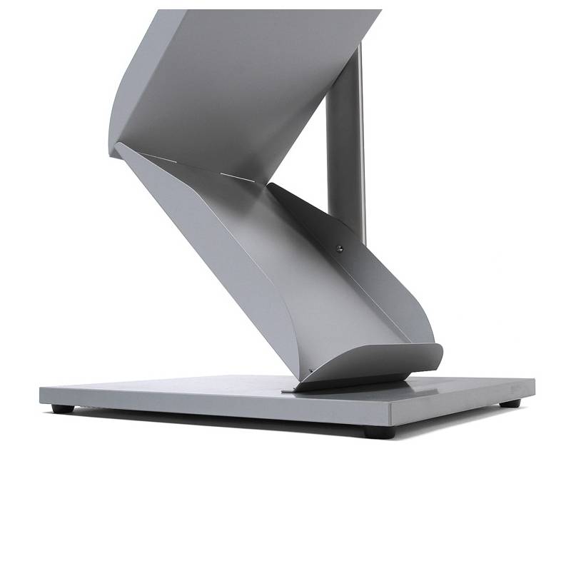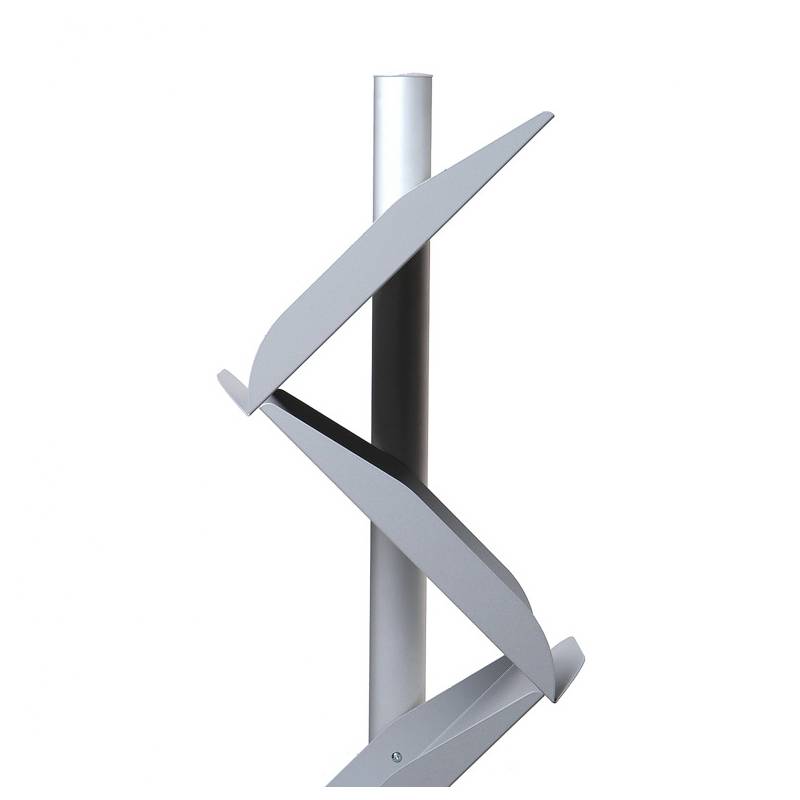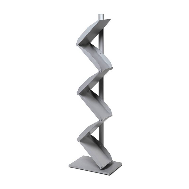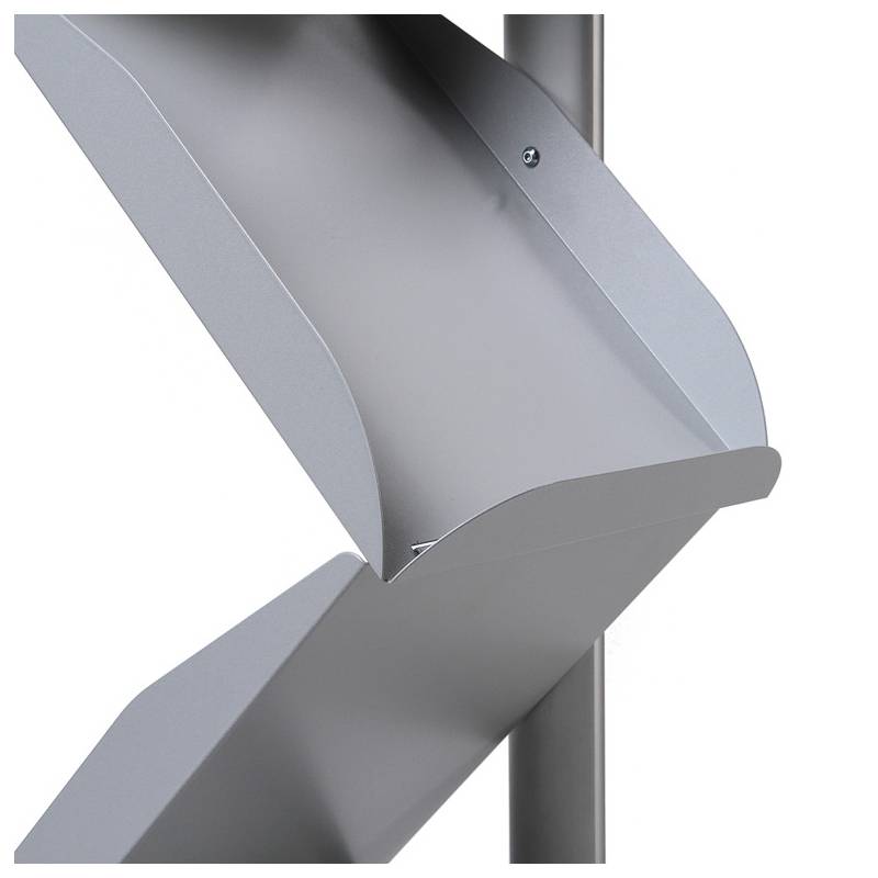 Lleva 6 estanterías con revestimiento en polvo en color gris para exponer folletos de formato A4 vertical.