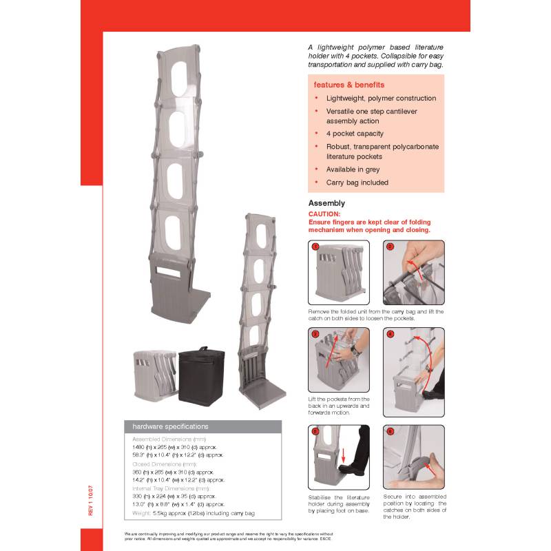 Portafolletos ligero y estable, se instala y dobla en un solo gesto guardando los documentos en su interior.