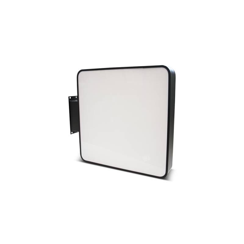 El letrero está montado en un soporte perpendicular a la fachada y es resistente a las condiciones climáticas como el viento, la lluvia y la radiación UV y puede usarse tanto en exterior como en interior.