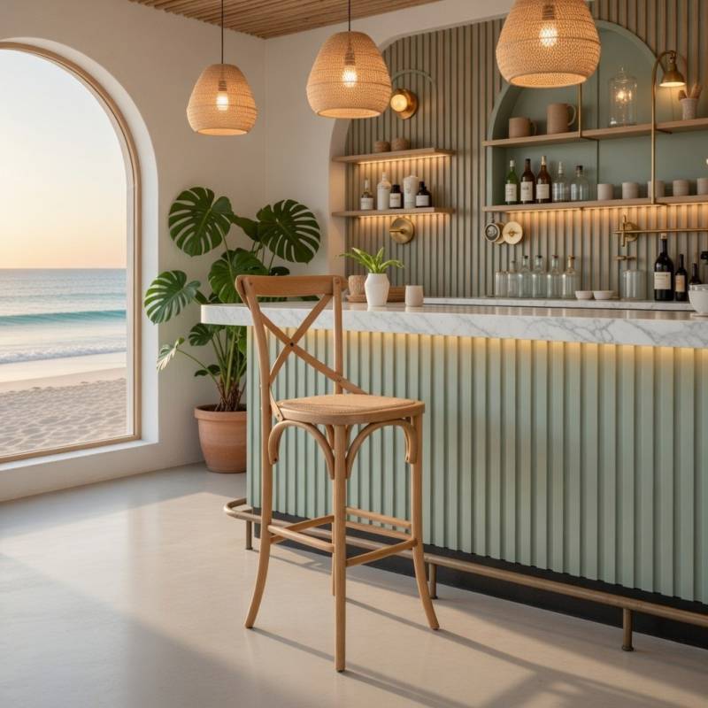 Taburete de estilo vintage en madera de abedul y ratan