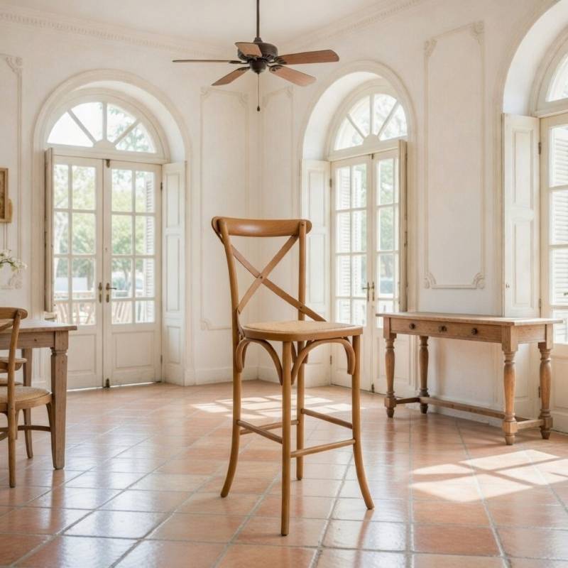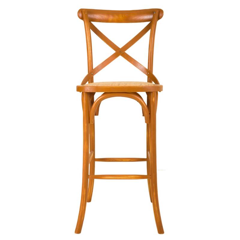 Fabricado con madera de abedul con una solida estructura de 4 patas, arco de refuerzo, reposapies cuadrado, y asiento de ratan.